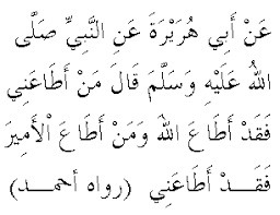 Rasulullah صلى الله عليه و سلم bersabda: “Barangsiapa mentaati aku, ia mentaati Allah سبحانه و تعالى dan barangsiapa mendurhakaiku, maka ia telah mendurhakai Allah سبحانه و تعالى . Barangsiapa mentaati pemimpin, maka ia mentaati aku dan barangsiapa mendurhakai pemimpin, maka ia mendurhakaiku.” (HR Ibnu Khuzaimah)